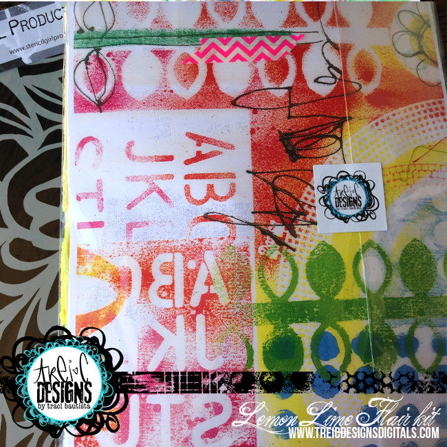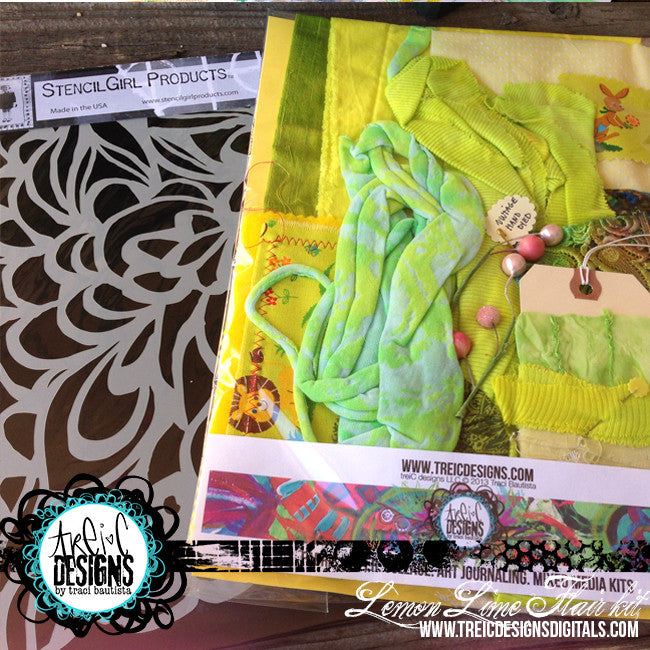 color palette: LEMON lime...bright greens and yellows with pops of fuchsia and turquoise. THIS is a one-of-kind kit.. contains a vintage silk flower, yoyo, hand stamped paper feather, vintage hand dyed fiber trims, handmade painted & dyed doodled fabrics and papers, one 4x6 art print.