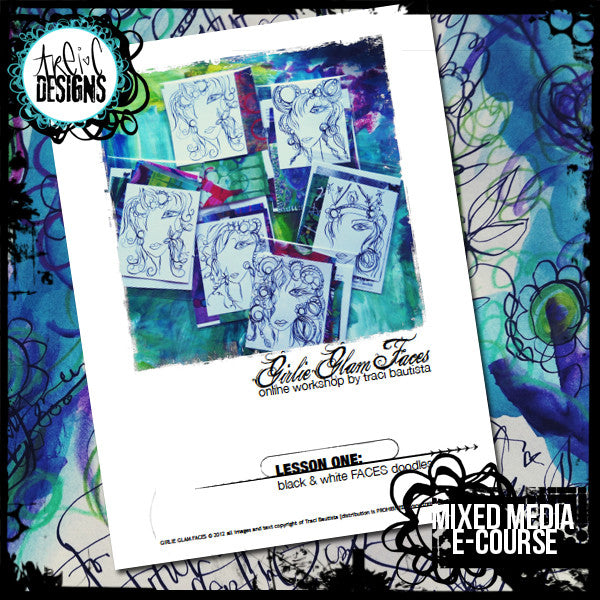 WORKSHOP DESCRIPTION | REDEFINE the Doodle: Girlie Glam FACES---> Take a creative mixed media journey to explore all about my Girlie Glam faces. Play with a variety of mediums from paint, canvas to markers and brushes while you create your own stylized faces and practice drawing a face each day. I'll share numerous background techniques including collage, watercolor and graffiti tissue paper. I'll provide art journal prompts to work on in combination with painting the faces. This workshop has a few videos lessons of techniques/projects in the Stylized Faces section of my book Doodles Unleashed PLUS all brand new content.