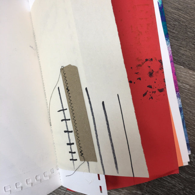 Then stitch together each journal by randomly selecting pieces that inspire me at that moment. They are torn or cut and stacked into piles, some are stitched wildly with free motion motifs while others are simple tucked and folded to reveal an additional space to write and make notes.
