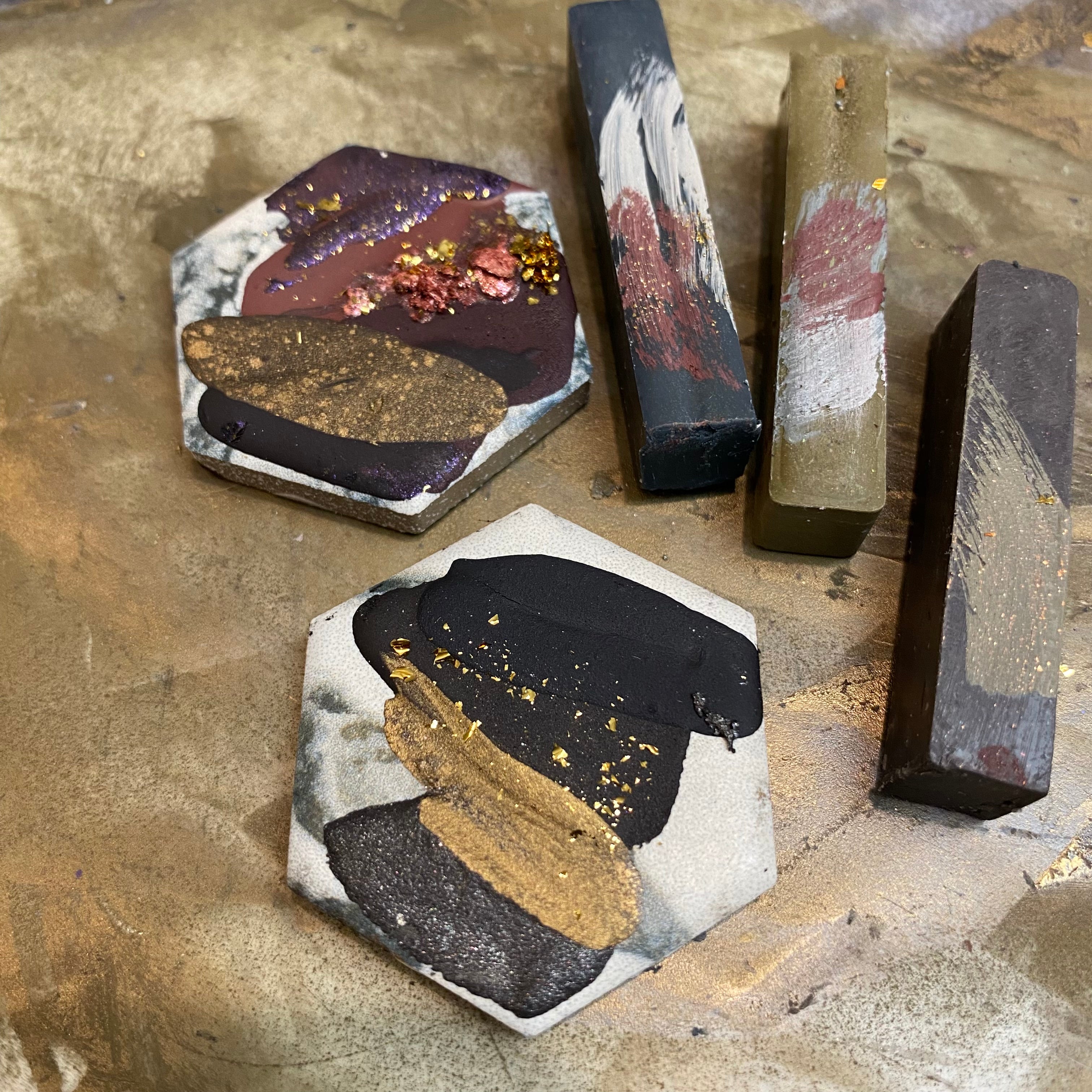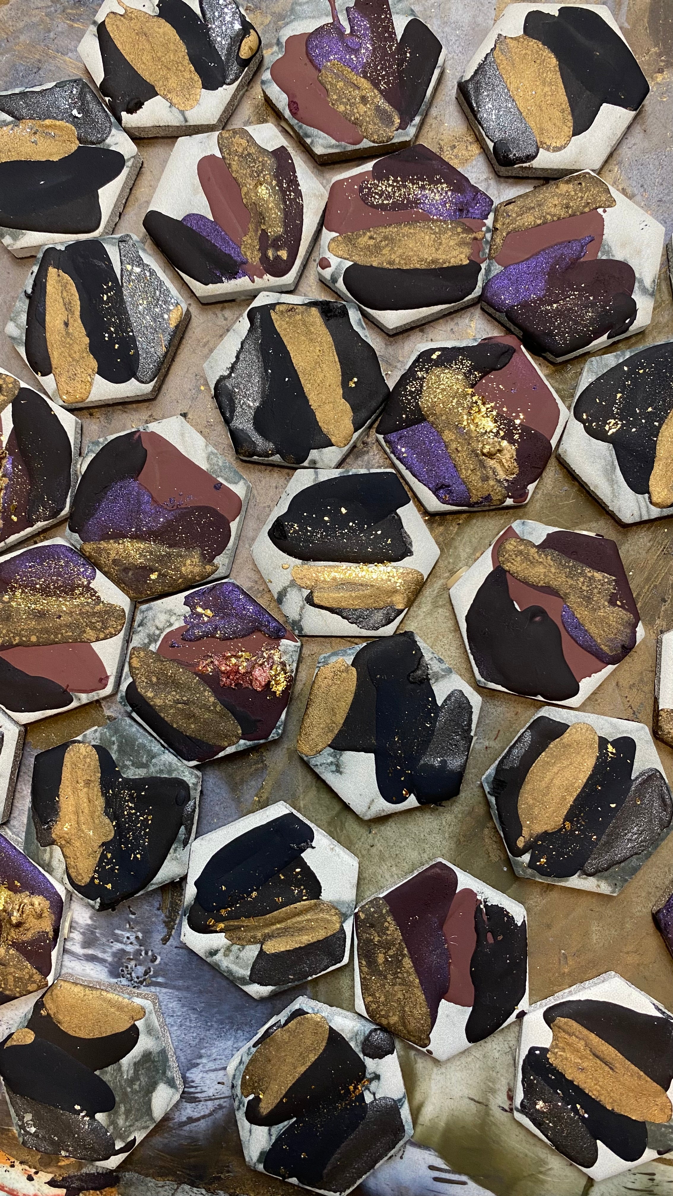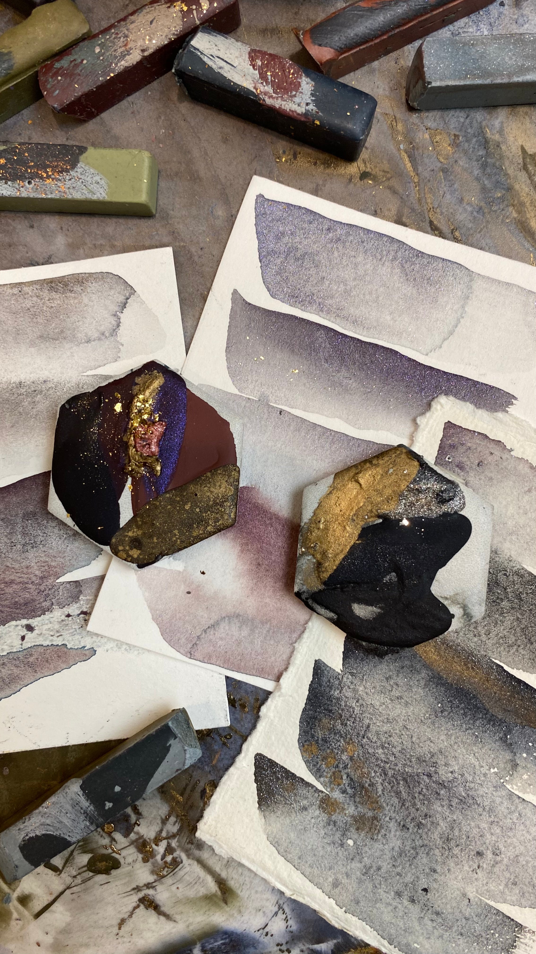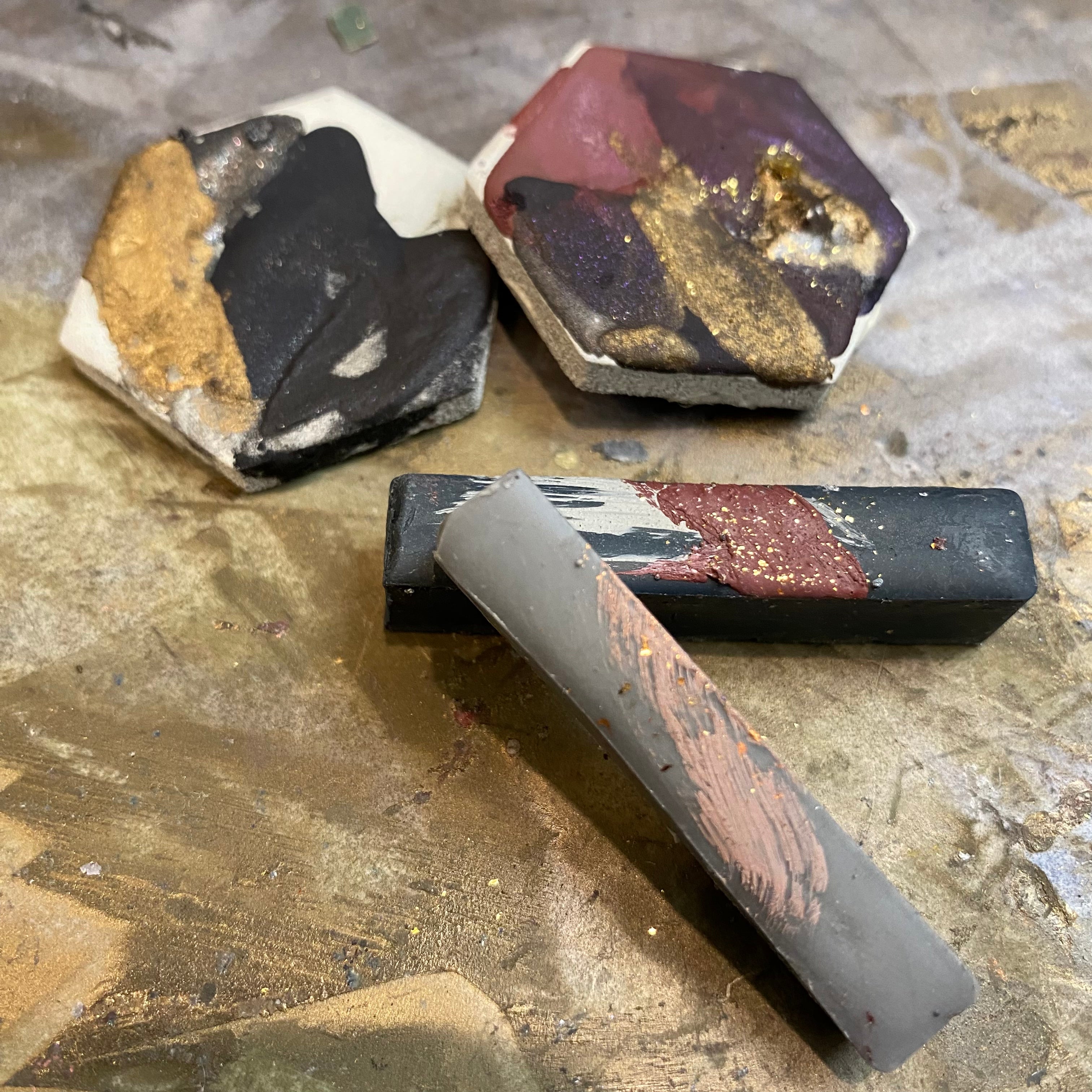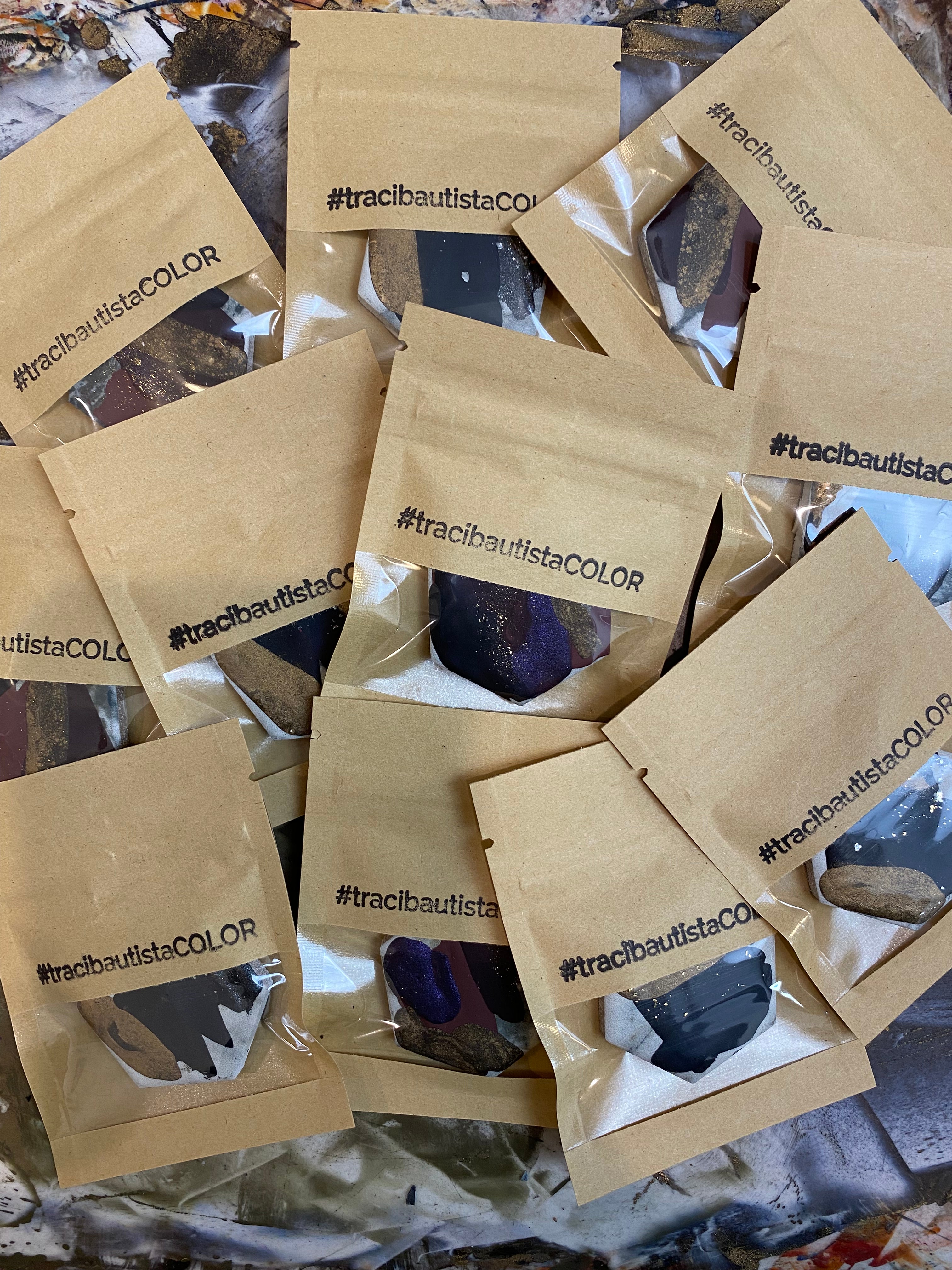 The entire handcrafted artisanal mixed media collection creates a beautiful range of colors when they are mixed and layered 🎨 Some paints have a bit of additional metallic flakes while others are marbled with layers of colors.