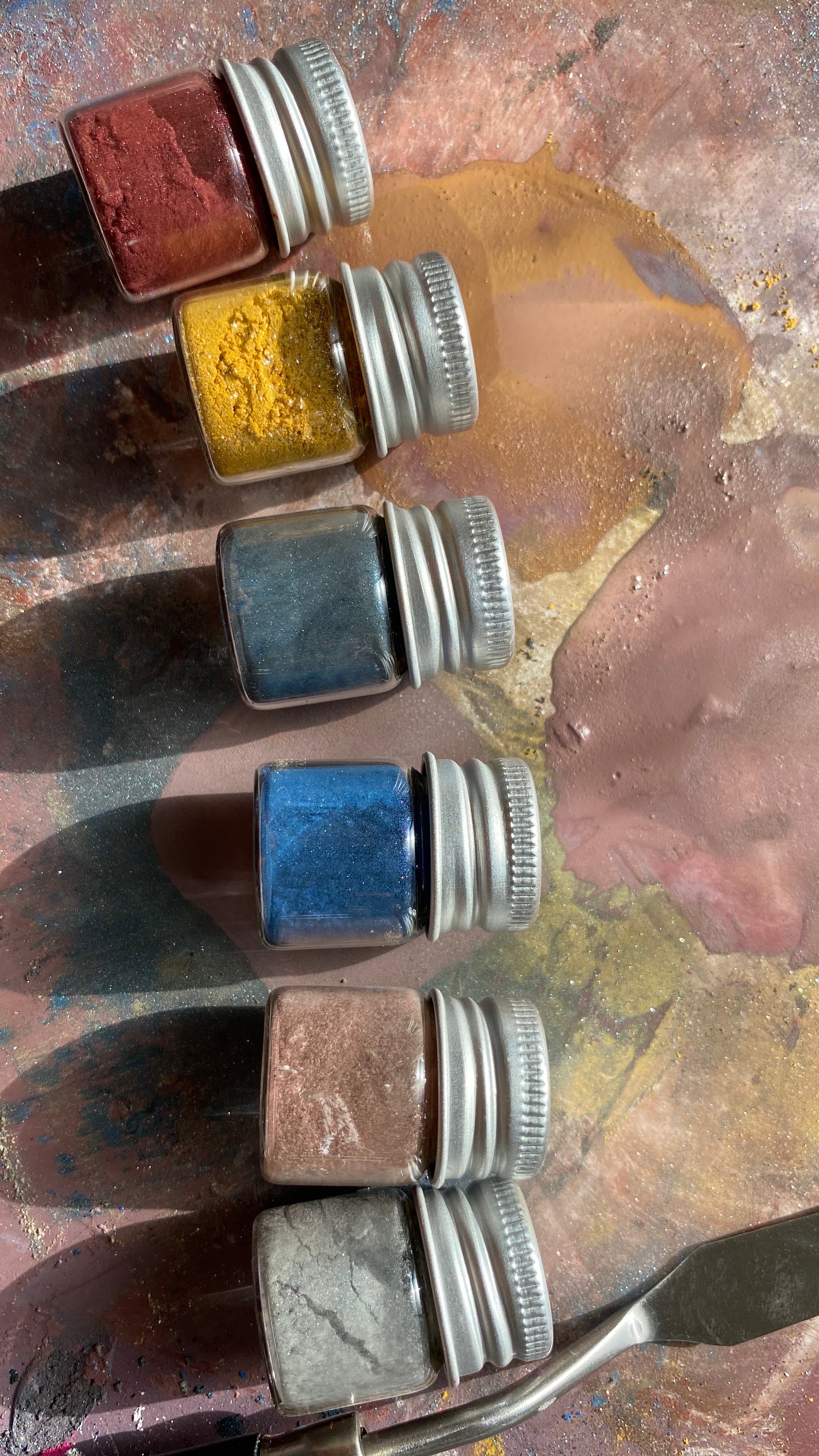 You’ll receive a set of SIX 5ml custom mixed #tracibautistaCOLOR pigments in glass jars, handmade binder, and empty pans.