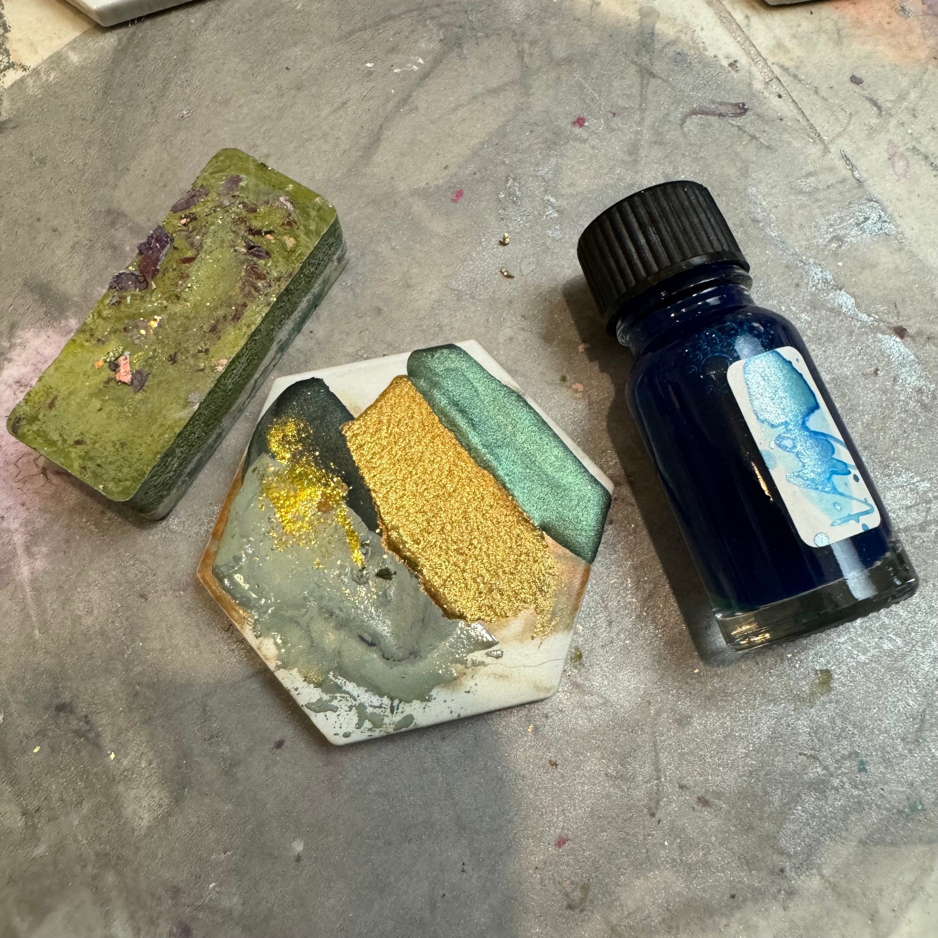 The entire handcrafted artisanal mixed media collection creates a beautiful range of colors when they are mixed and layered 🎨 Some paints have a bit of additional metallic flakes while others are marbled with layers of colors.