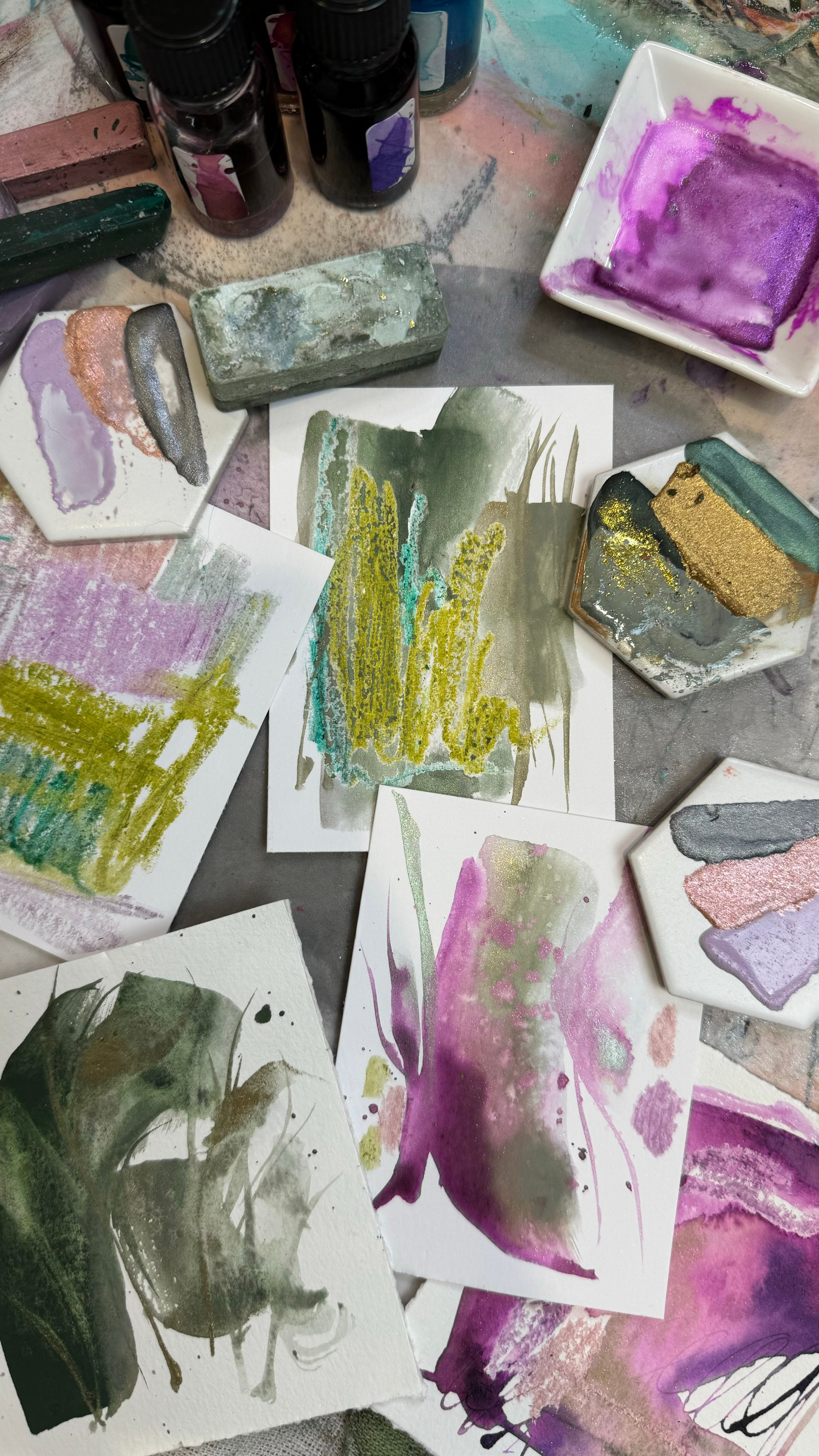 You'll receive a beautiful package full of handcrafted watercolor in a thematic color palette...perfect for your art journal or sketchbook. And great for WATERMEDIA PLAY AND FLUID ART techniques.
