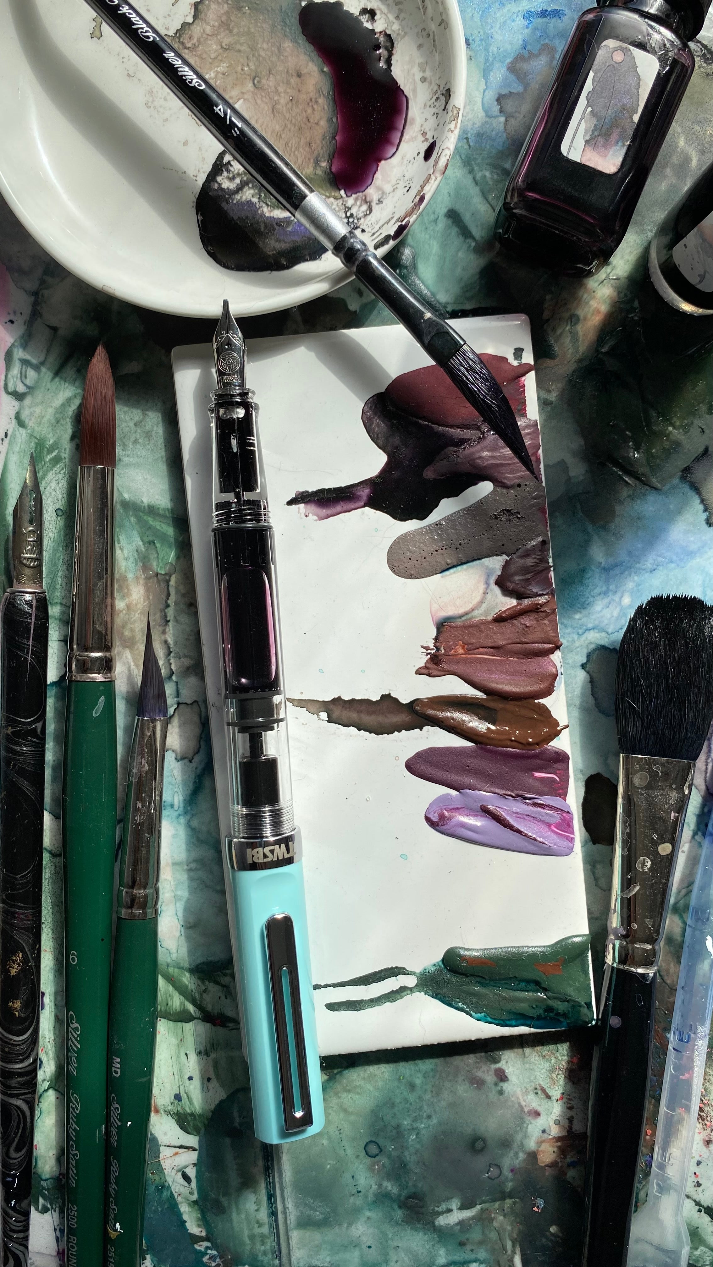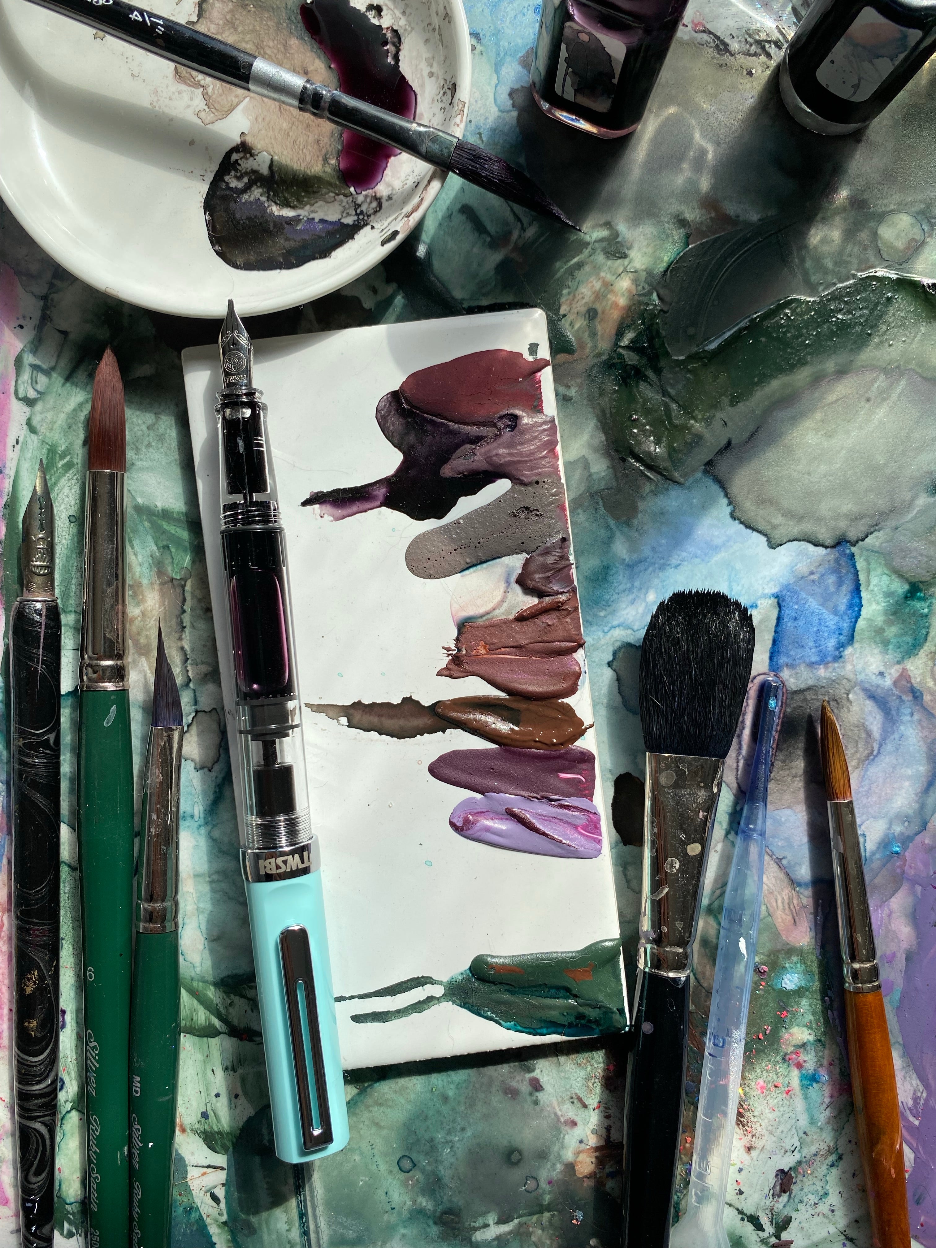 These are not your traditional watercolors...they have different variations of metallic sheen, some have a gritty texture and multiple pigments and/or dyes.