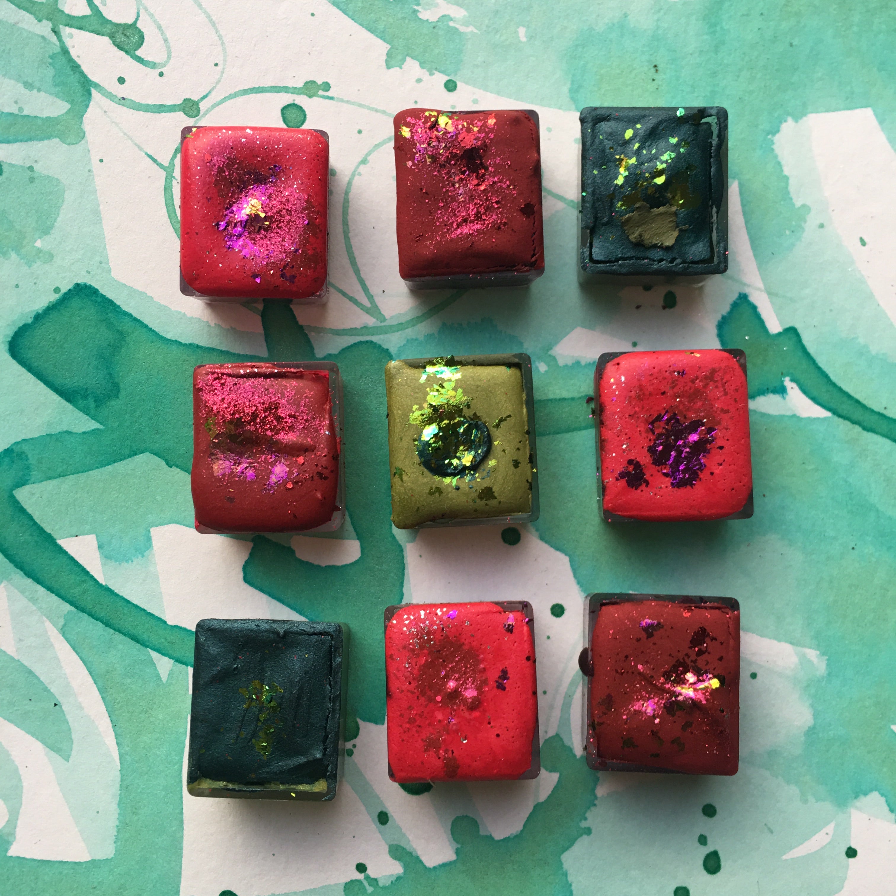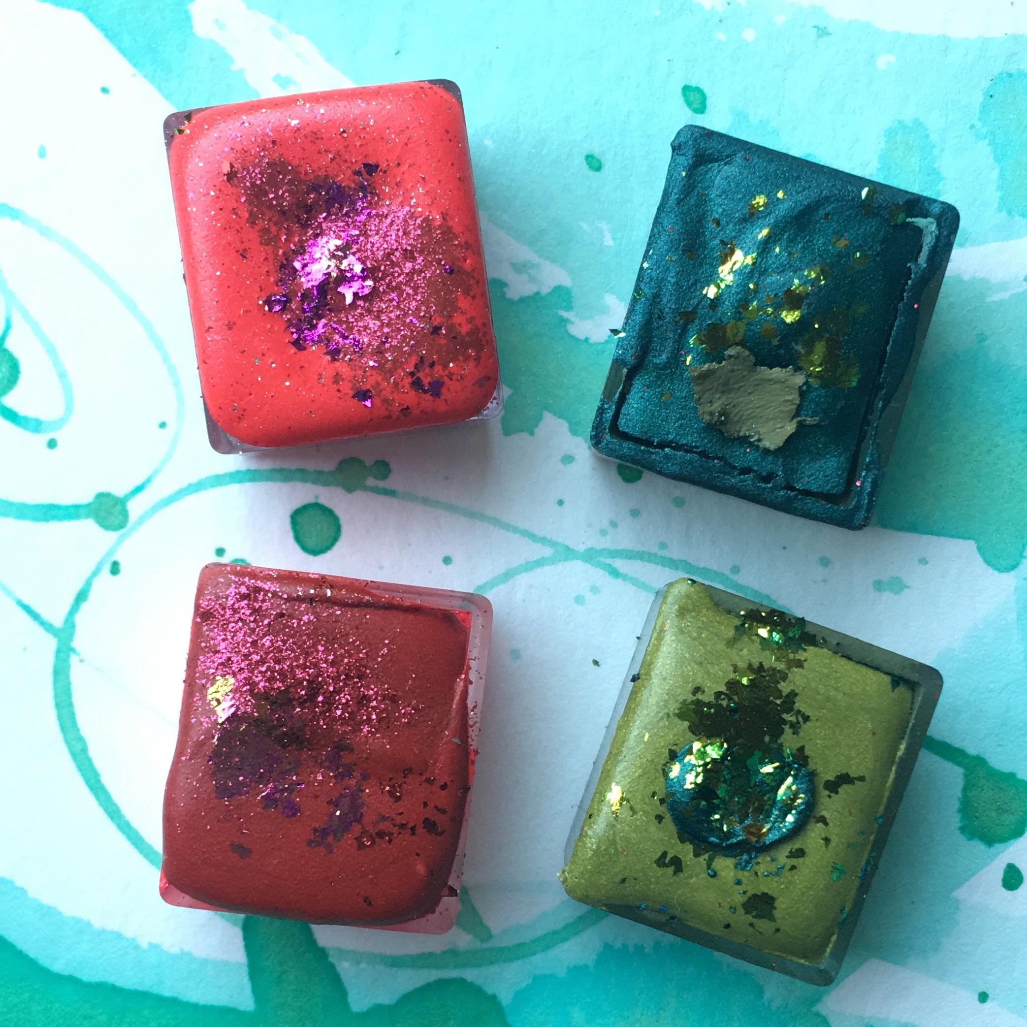 These are not your traditional watercolors...they have different variations of metallic sheen, some have a gritty texture and multiple pigments. NEVER any fillers or added fluff.