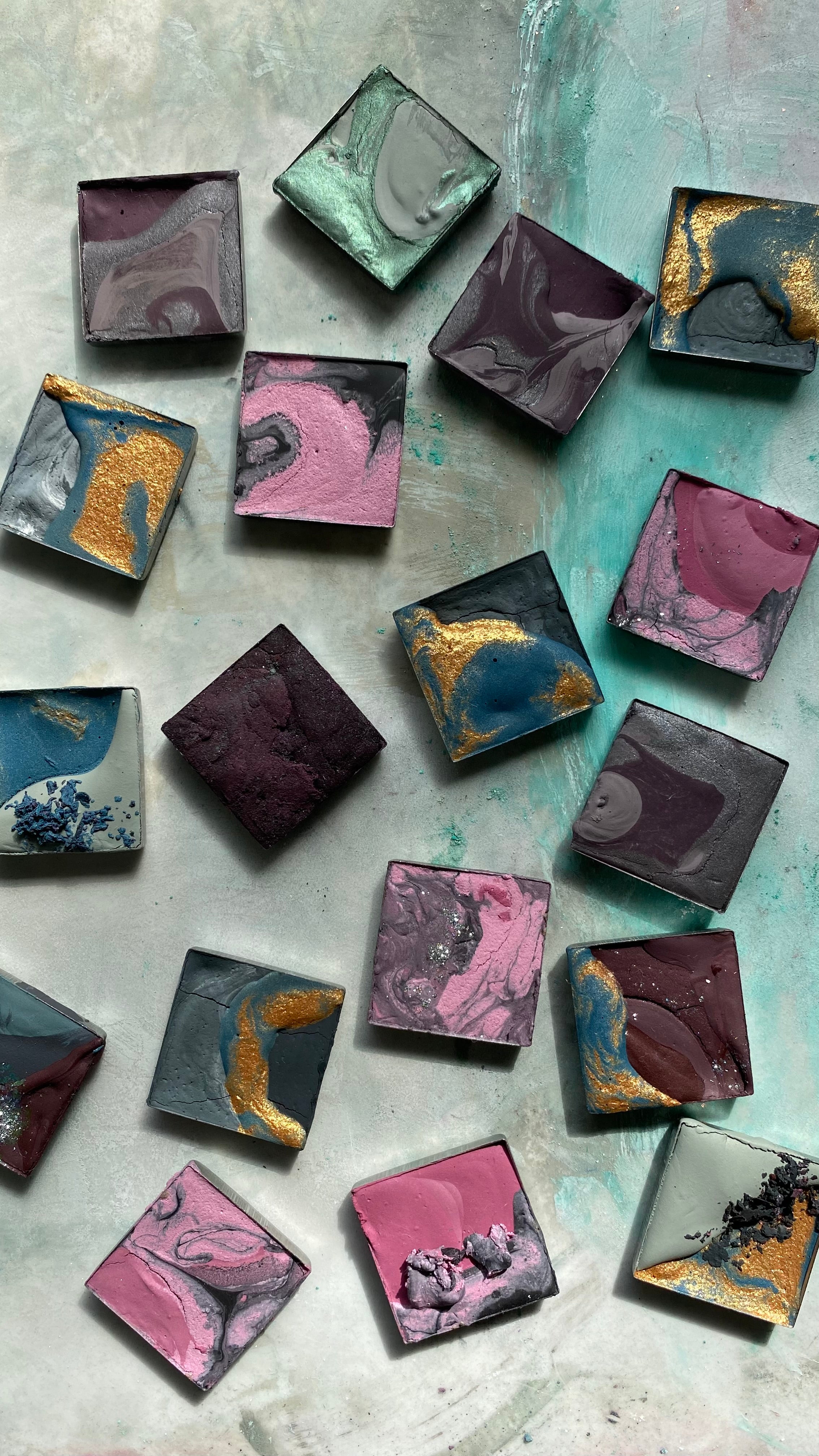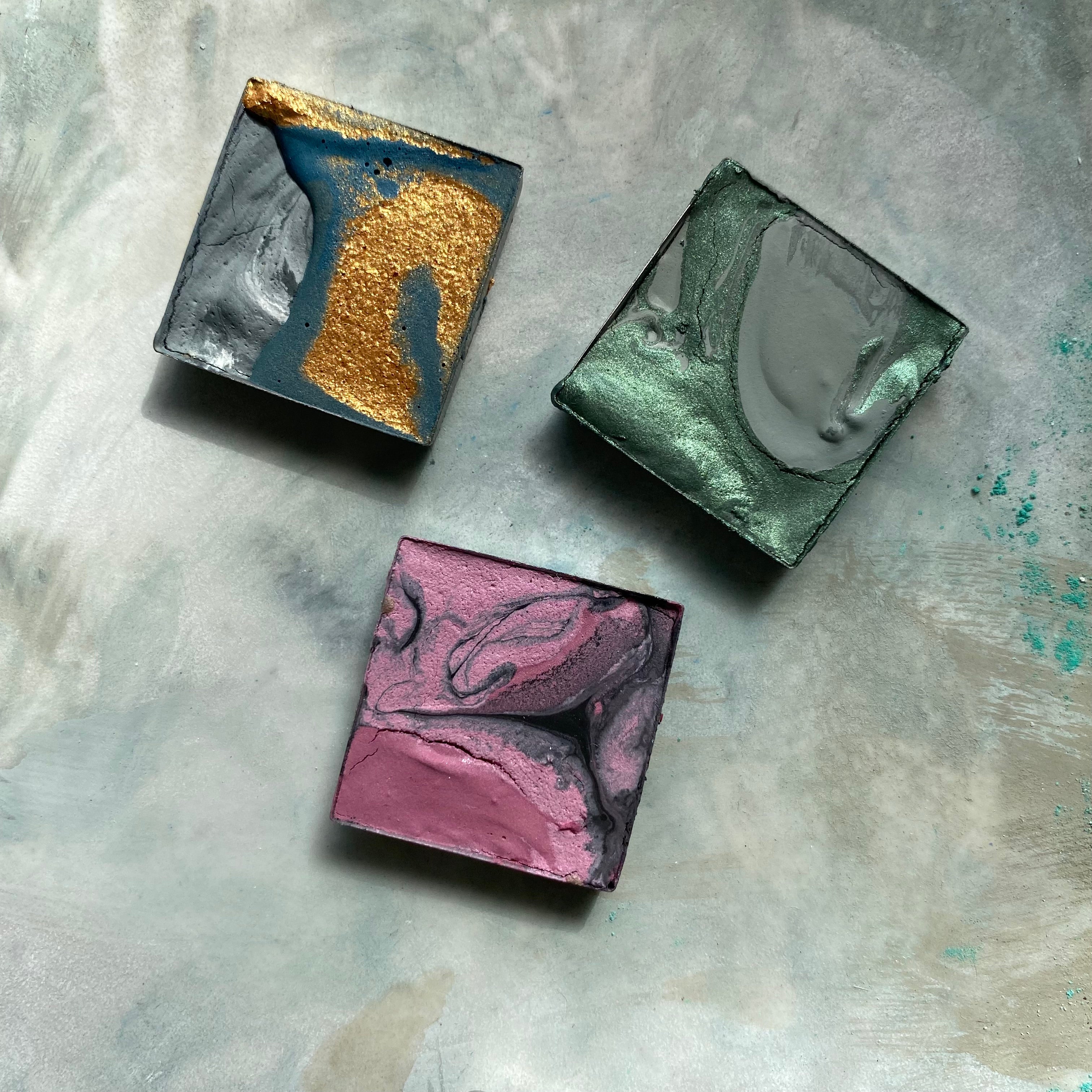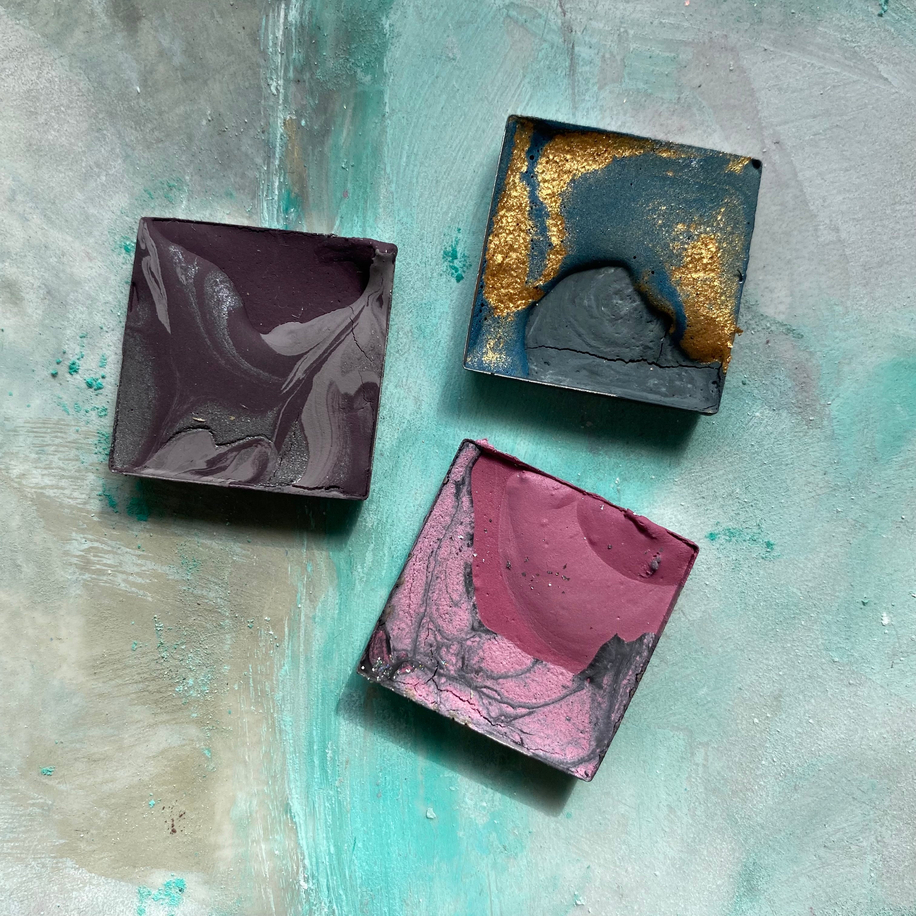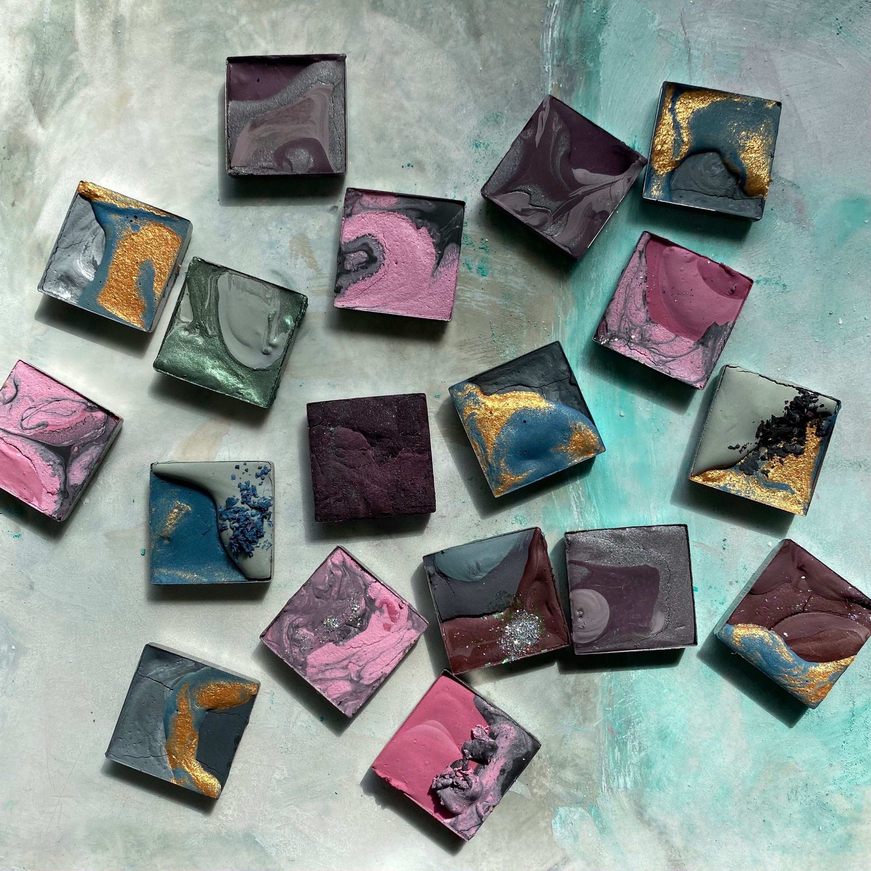 The handmade artisanal watercolor collection contains a variety of the following (each set is slightly different and will include a variety of colors in the REIMAGINE color palette} :