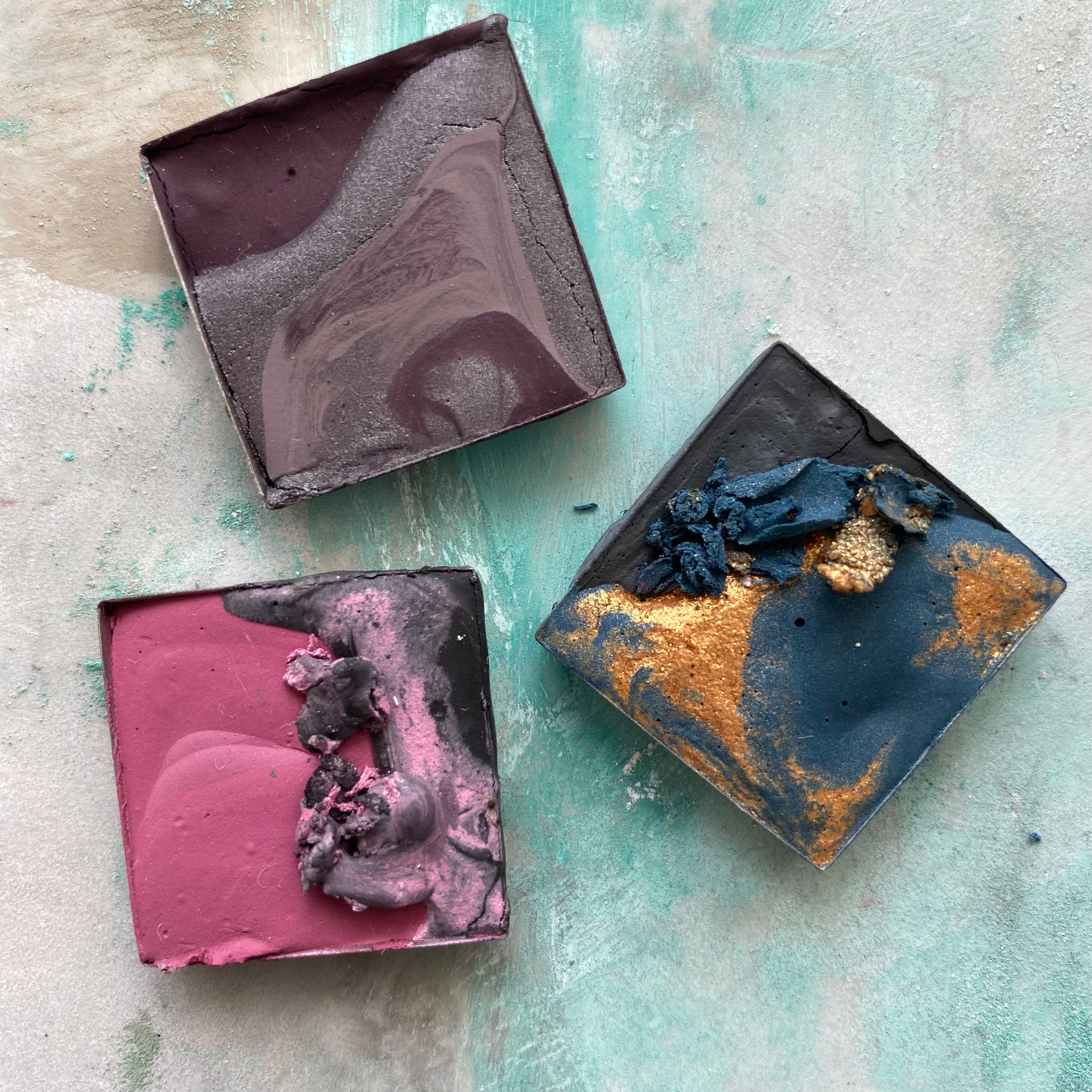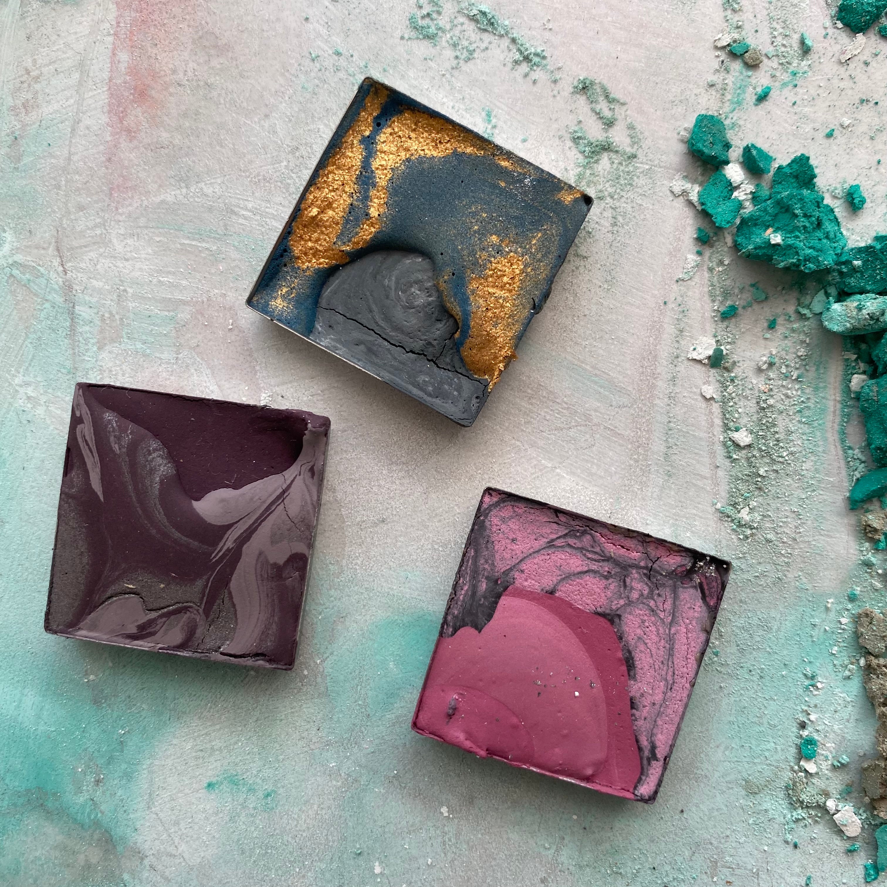 ALL pans have a magnificent sparkle with the addition of metallic flakes while others are marbled with layers of colors. Each half pan is one-of-a-kind. You will receive 2 or 3 different multi-color pans that will be similar to those in the product photos.