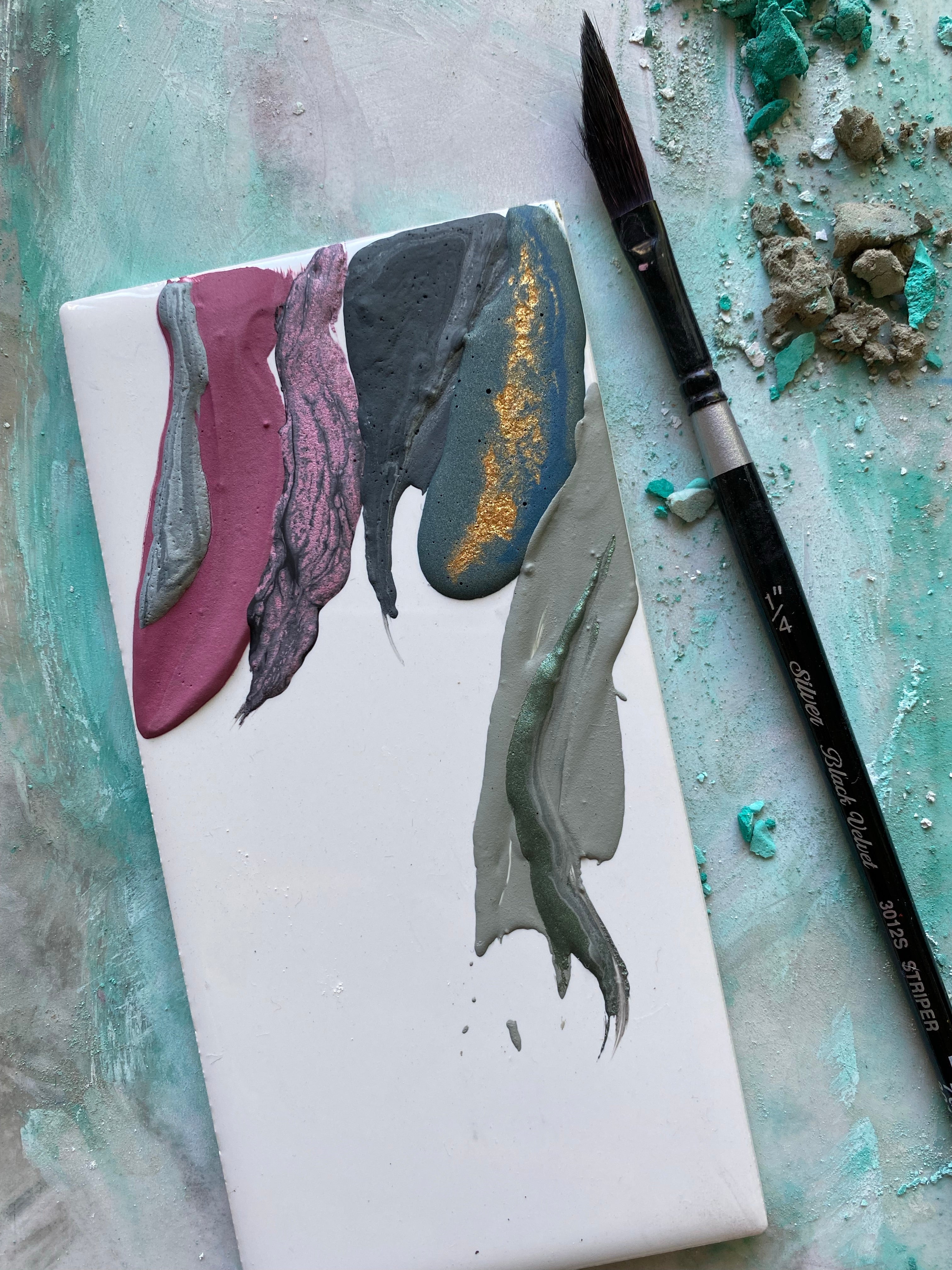 Each 3”x 6” ceramic tile contains 6-8 multi color XL paint swatches from the collection. Some are topped with a little added metallic flake and sparkle.