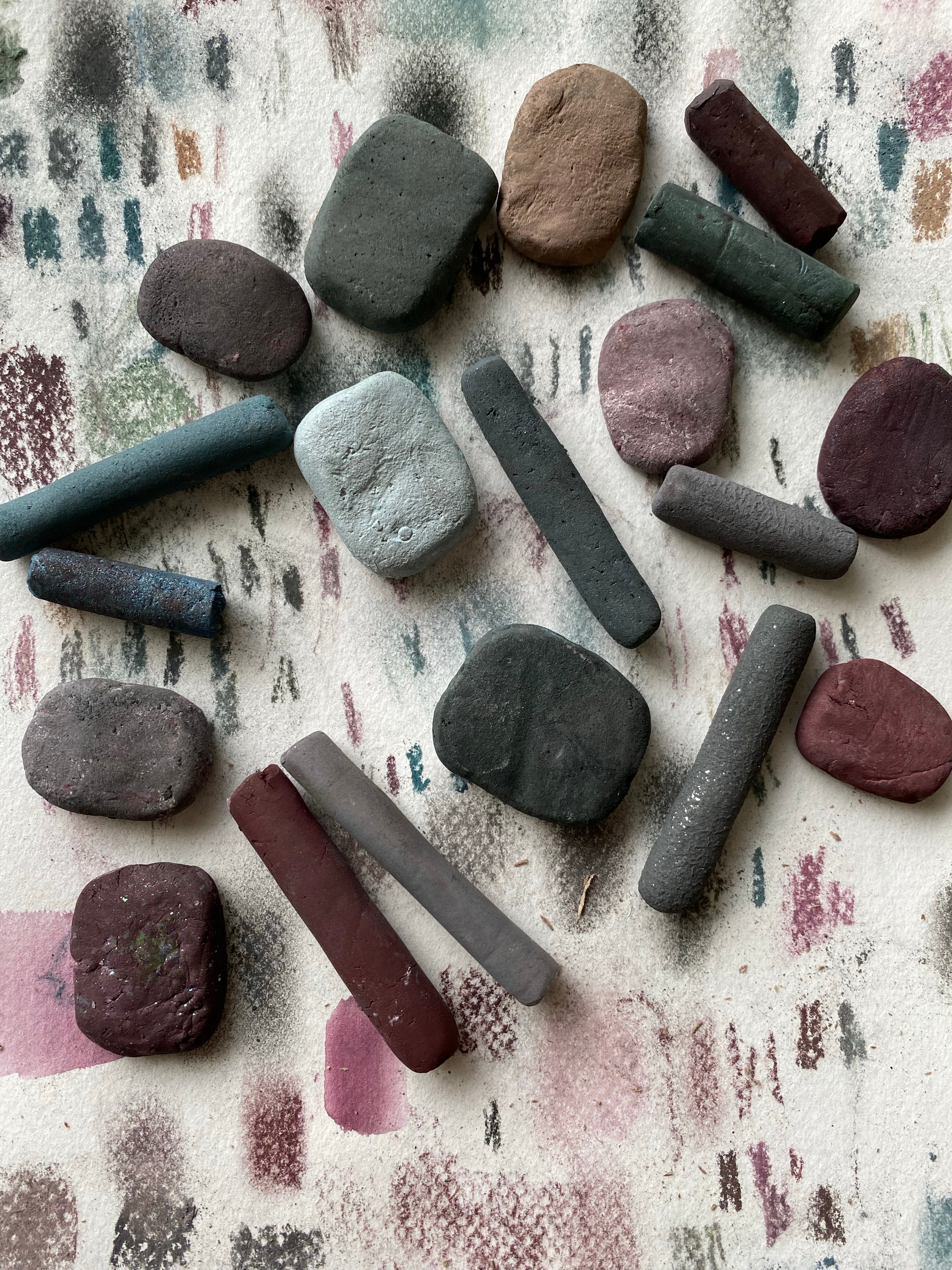 When you use them wet, they create gorgeous watercolor washes or creamy rich textures. When you use them dry, they draw like hard and soft pastels. Each stone has a different texture depending on the pigments and binder used to create it.